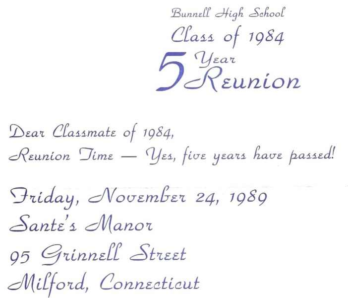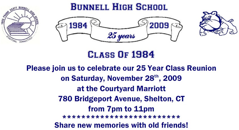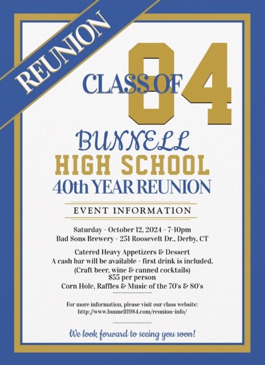 Our 30 year reunion was to be held on October 18, 2014 at the Courtyard Marriott in Shelton, CT. Unfortunately, due to lack of interest, financial loss, and a grand total of 1 paid reservation, we were forced to cancel the reunion.
